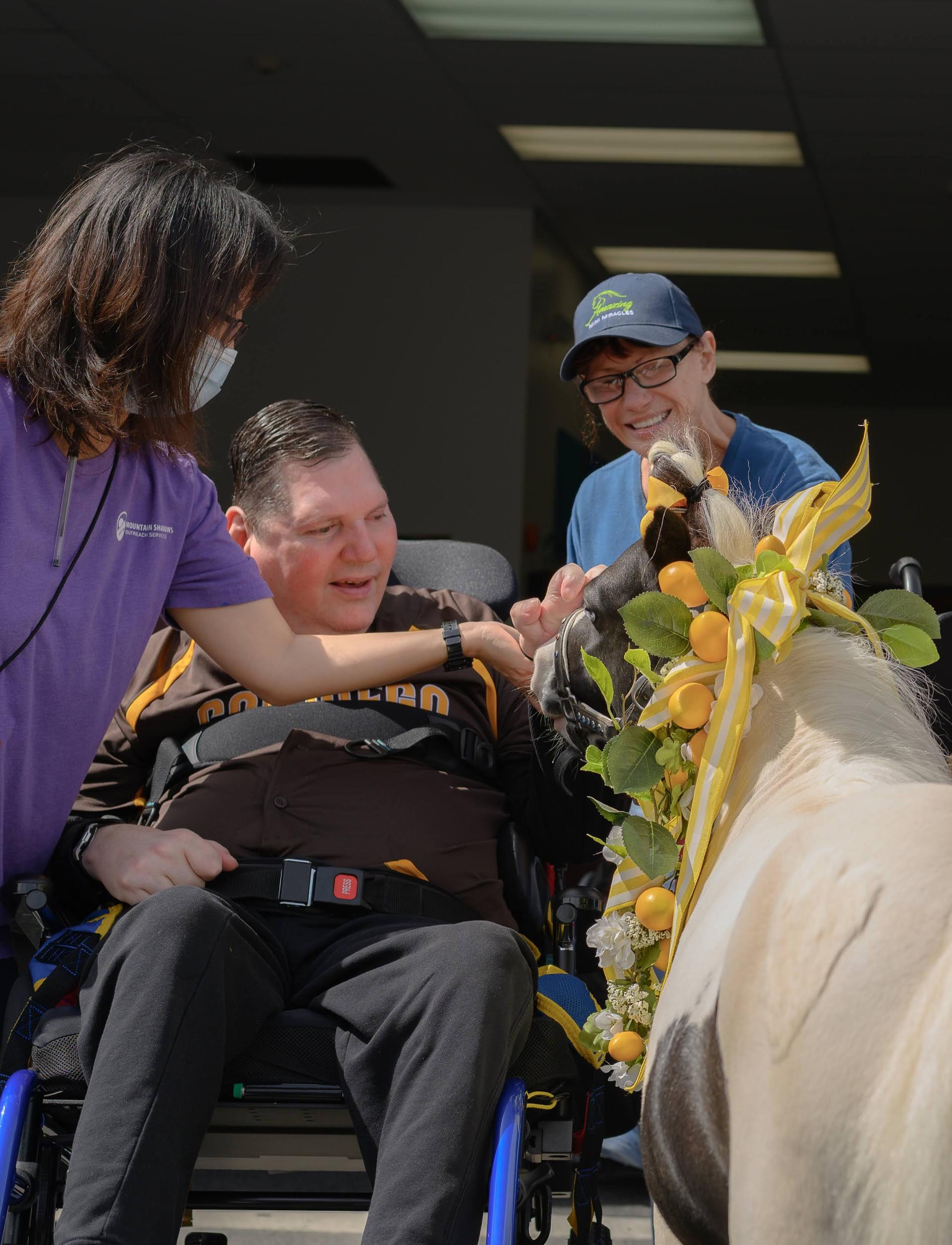 “This was a very, very positive introduction to therapy animals for our clients,” says Heath. “Our MSNB clients have extreme behavioral challenges as well as developmental disabilities. This kind of venture with the therapy horses was new to them. “Some of our clients were a little bit nervous at first. It’s not what they’re used to. But some of them, with guidance, were able to pet the horses – and then you could see the smiles on their faces! “One client was relaxing in the MSNB sensory room. We had to convince him to come out and see the horses. And as soon as he came out, he reached for the horse and started petting it. Then he had the BIG smile on his face.” |