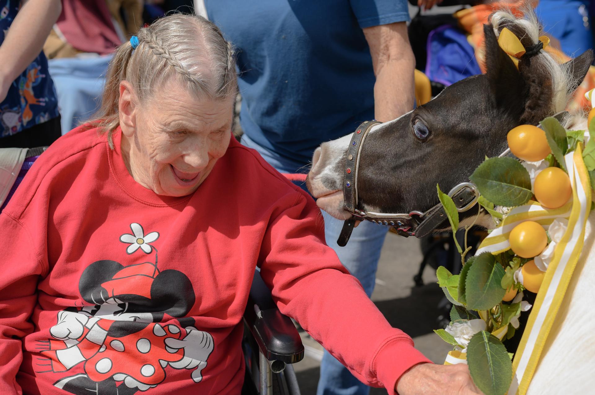 Mini horse “Sweetie” from Amazing Mini Miracles gives big, sweet kisses as Patsy,