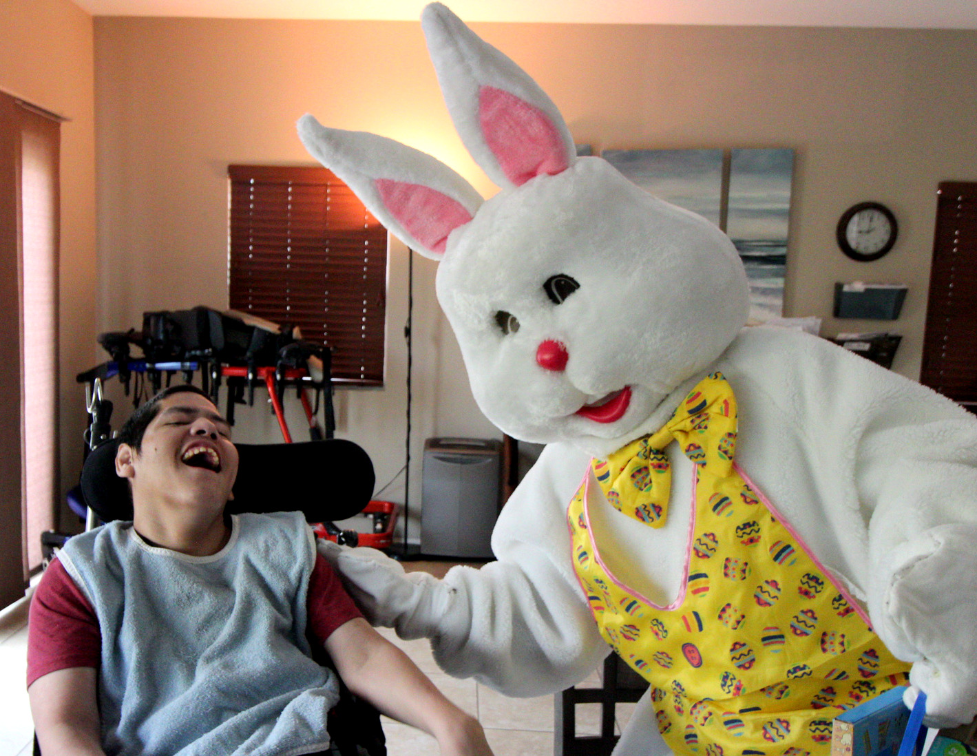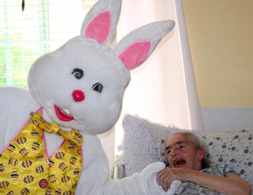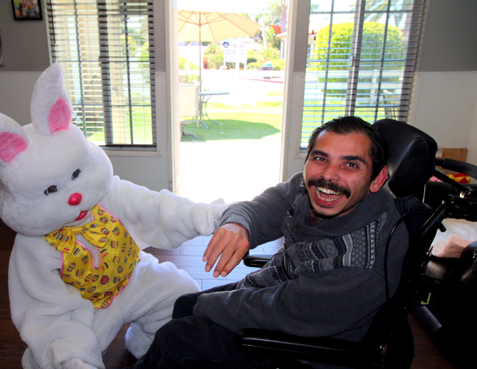 MSCH-San Diego resident, Jesus, shares a laugh with Spring Bunny. |