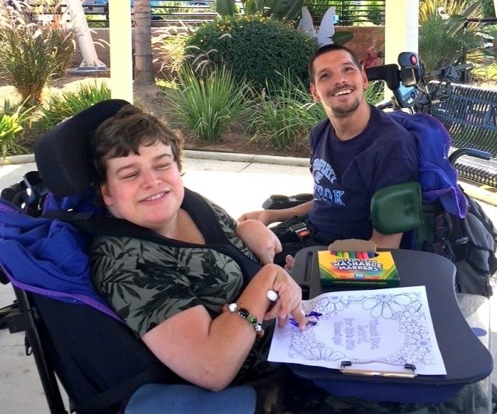 Rachel and MSCH – San Diego friend, Josh, coloring together. “Rachel takes a lot of pride in how many pages she can color in one sitting,” says John.