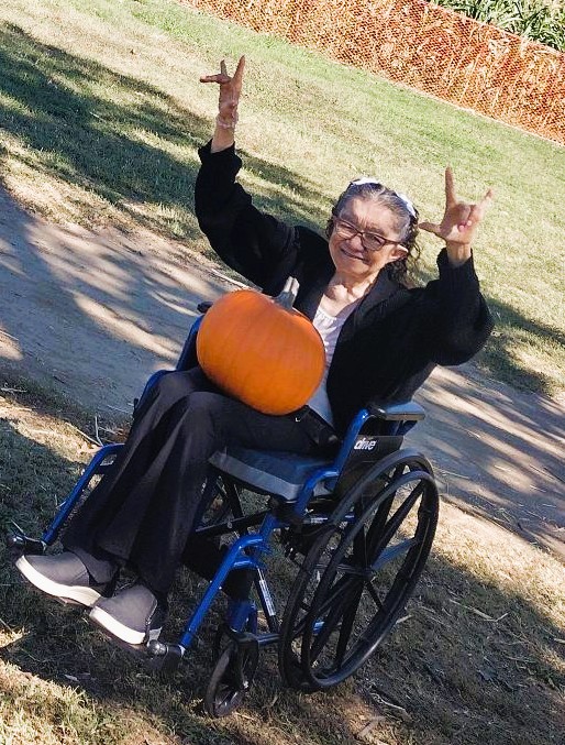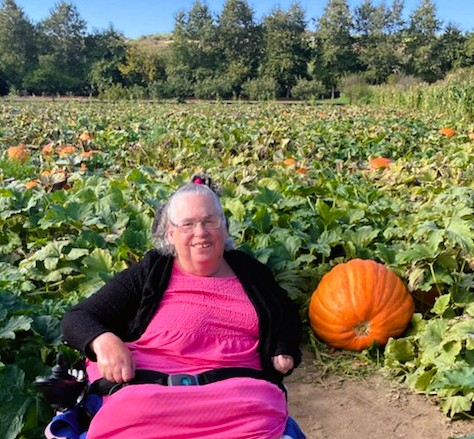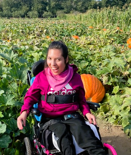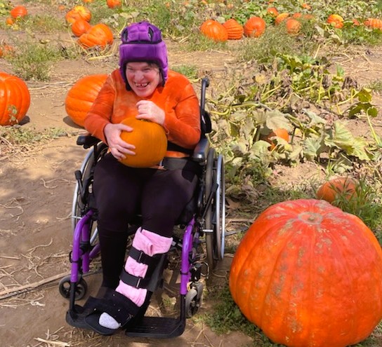 “Margo doesn’t always participate in activities,” says Gloria. “But she loved Bates Nut Farm. She was smiling, and holding a big pumpkin in her lap. And she was holding up the “I love you!” hand sign! It was so great to see that.” |