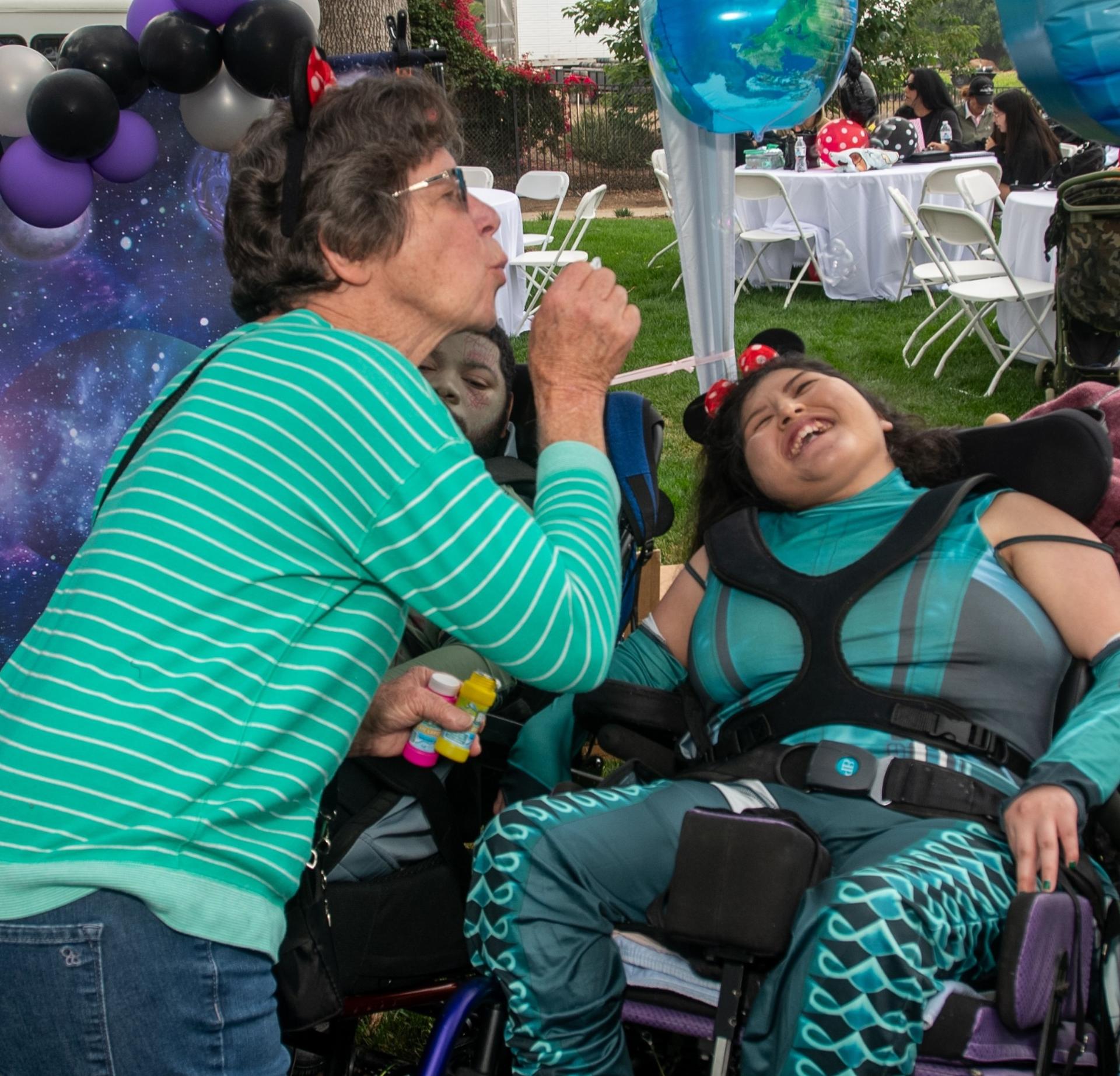 Ruth Hill, Mountain Shadows Foundation Board of Directors, and former MSCH-Riverside RN Health Care Coordinator, blows bubbles to the delight of resident, Kareli. |
